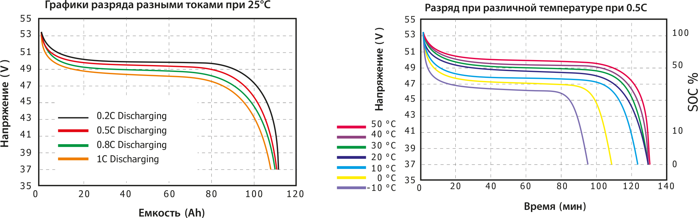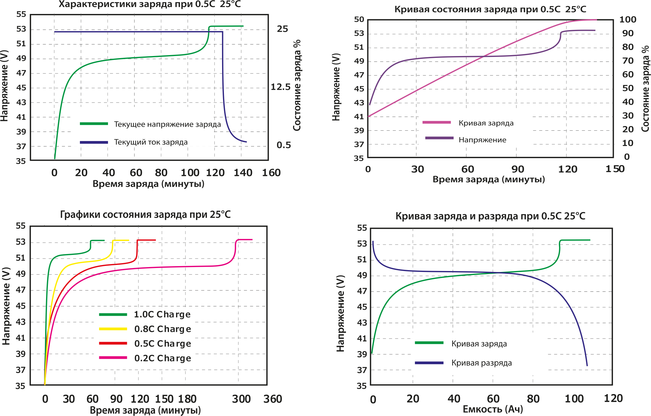 Режим заряда — 0.2C-0.3С до напряжения 56,0В, затем постоянным напряжением 56,5В и током не более 0,05С