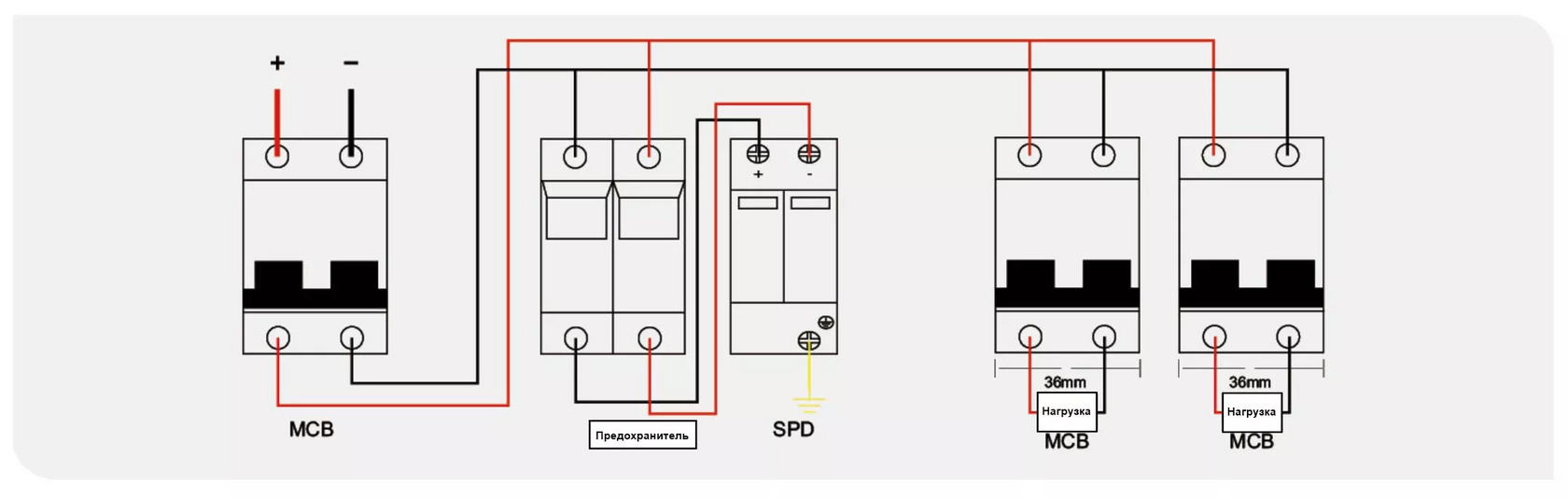 УЗИП постоянного тока 2P должно быть установлено параллельно в защищаемых сетях постоянного тока и обеспечивать защиту как общих, так и различных моделей. Рекомендуется устанавливать его на обоих концах линии электропитания постоянного тока (со стороны солнечной панели и со стороны инвертора/преобразователя), особенно если линия прокладки является внешней и длинной.